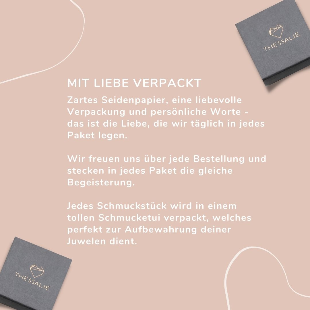 Mein Name ist Theresa und ich bin die Gründerin von THESSALIE. Wir stehen für besonderen und qualitativ hochwertigen Schmuck aus 925 Sterling Silber. Unsere individuellen Designs der Ketten, Ohrringe, Armbänder und Ringe werden von mir mit viel Liebe zum Detail gestaltet. Mit unserem Faible für Trend und Inspirationen, möchten wir Dir mit unserem Label THESSALIE ein ganz besonderes Schmuckerlebnis bieten. Unsere Schmuckstücke sind von zeitloser Schönheit, die Dich jeden Tag bereichern. Dabei kannst Du alle unsere Schmuckstücke miteinander kombinieren. Erfahre hier mehr über uns!